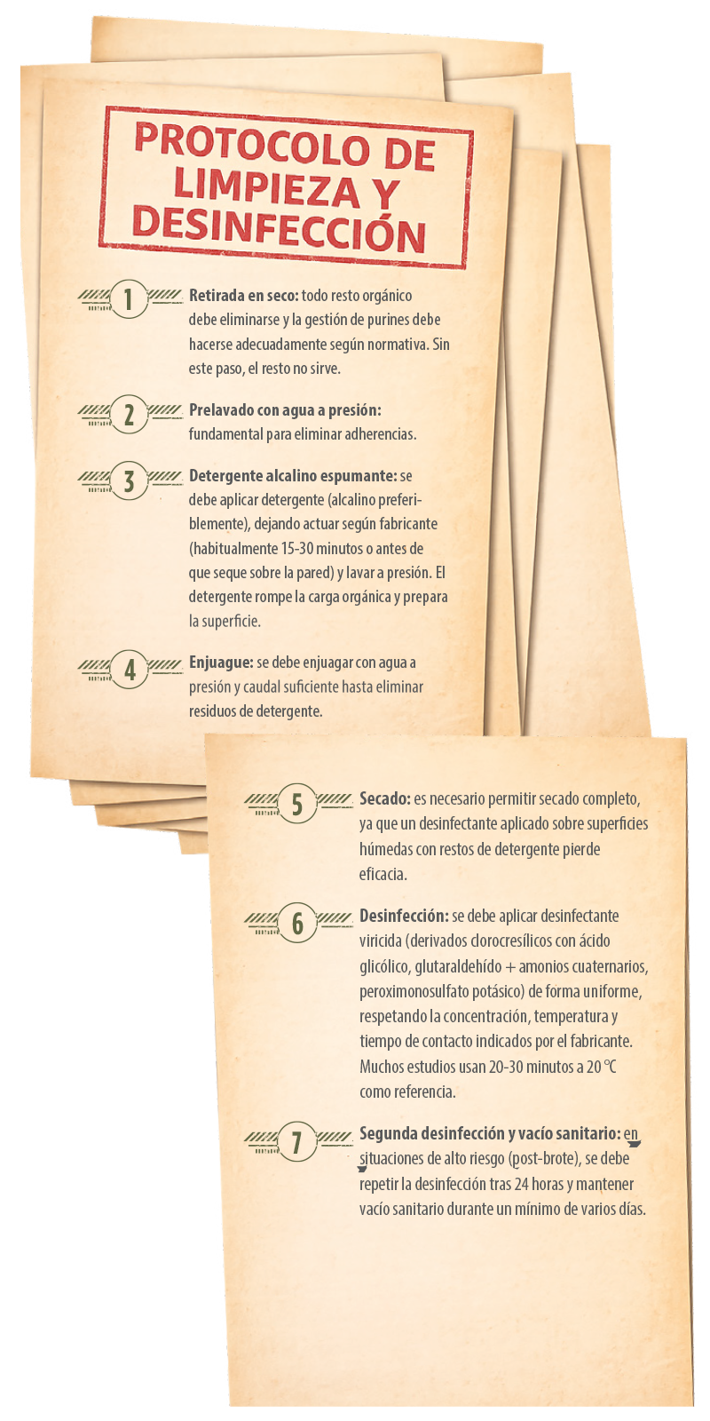 Los viricidas (por ejemplo, formulaciones en base a Cresoles + Glicoles, Glutaraldehído + QAC, Peroximonosulfato potásico) necesitan concentración correcta, tiempo de contacto real, poca carga orgánica y agua con dureza controlada.