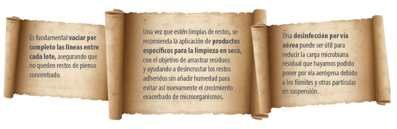 El pienso viaja veloz por las líneas de alimentación, pero deja detritus, migajas, polvo graso que, junto a la humedad, ya sea, de la explotación o bien tras una limpieza a fondo con la penetración de esta en el interior de las líneas, se vuelve un cemento orgánico, una costra adherida a las paredes internas de las líneas.