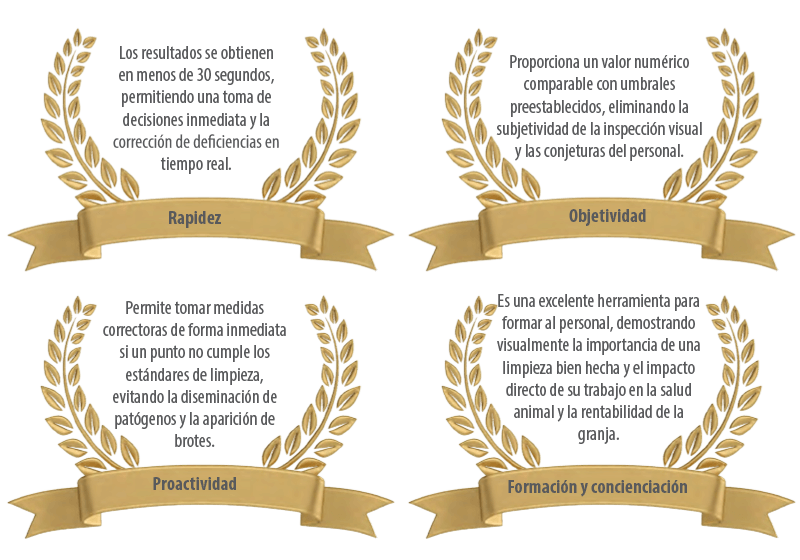 Su aplicación en los puntos críticos mencionados (paredes de silos, bebederos, conductos de aire, superficies de equipos, suelos, paredes) permite mapear la granja: un código de colores sobre plano revela puntos calientes que insisten en fallar, permitiendo focalizar los esfuerzos de limpieza.