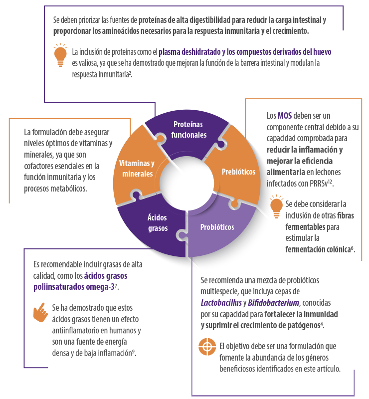 Las proteínas funcionales como el plasma deshidratado y derivados del huevo también pueden mejorar la función de la barrera intestinal y modular la respuesta inmunitaria, reforzando los principios centrales de esta estrategia2.