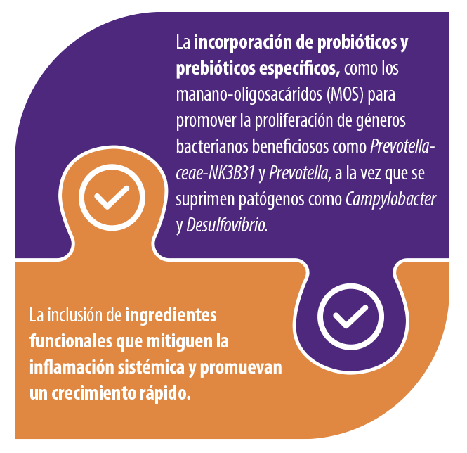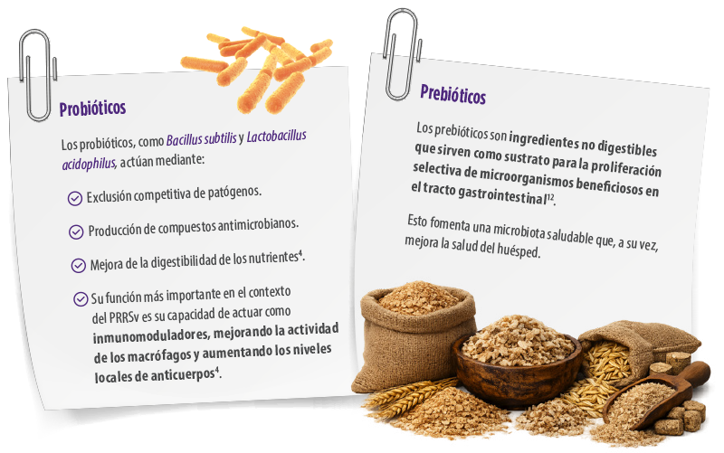 Los probióticos y prebióticos son componentes clave de la estrategia Active Feeding, ya que actúan directamente sobre el microbioma intestinal para modular la respuesta del huésped.