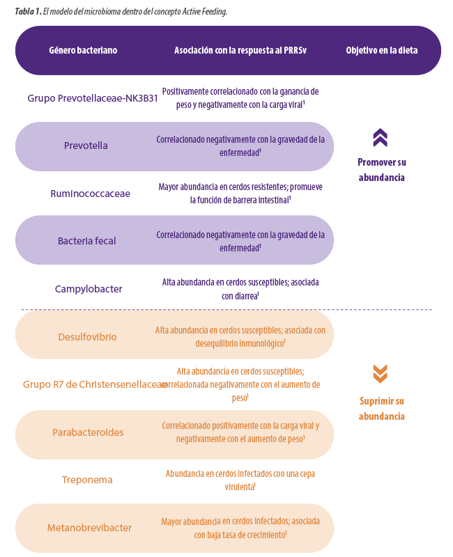 Los estudios de Wang et al. (2000) y de Argüello et al. (2011) indican un aumento en la abundancia y diversidad de la microbiota intestinal después de la infección por PRRSv, un hallazgo que sugiere una ruptura del estado homeostático del ecosistema microbiano1,11.