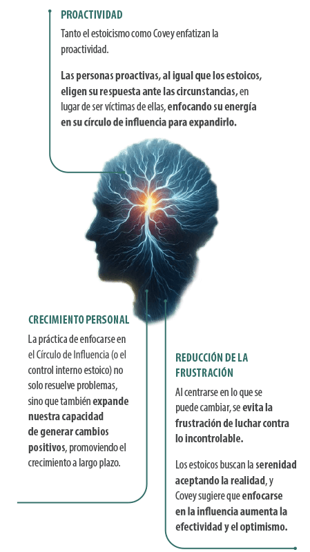 Los estoicos (como Epicteto) enseñan a centrarse en nuestros juicios y acciones, mientras que Covey define el Círculo de Influencia como aquello que depende de nosotros (nuestras respuestas, decisiones) y el Círculo de Preocupación como lo externo. Otros puntos en común son: