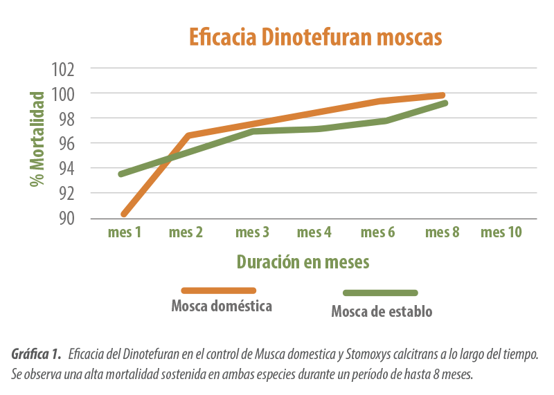 Los ensayos de campo realizados en el control de mosca doméstica (Musca domestica) y mosca de establo (Stomoxys calcitrans) demuestran que el producto es altamente eficaz para el control de ambas especies durante períodos de hasta 8 meses.