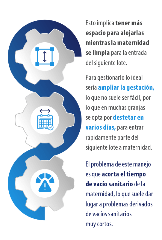 Si desea alargar el tiempo, es necesario disponer de espacio para dos lotes (rotación de 10 semanas), lo que habitualmente implica ampliar las plazas de transición y acomodarlas a lechones que pueden superar los 30 kg de peso.