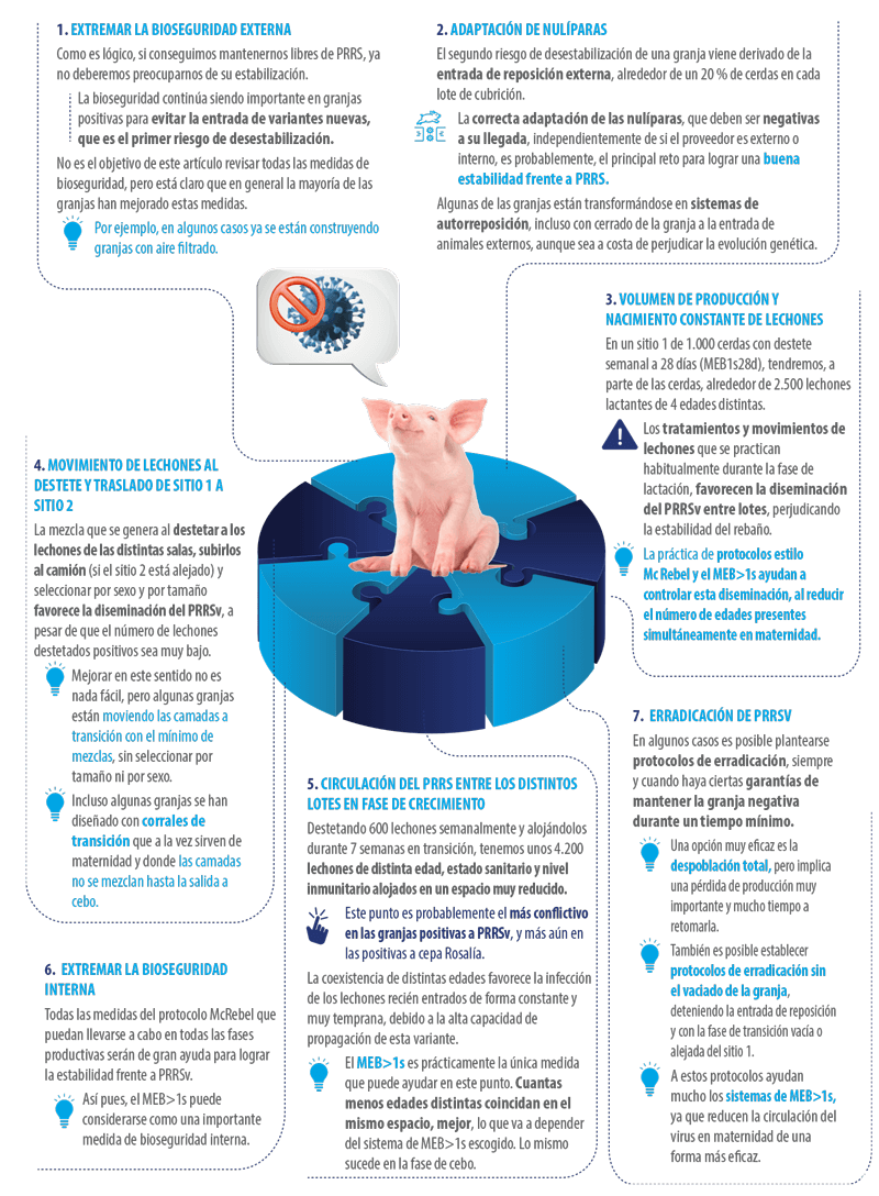 Probablemente, el caso del virus PRRS es donde la estabilización sanitaria constituye un mayor reto. Los puntos críticos son los siguientes: