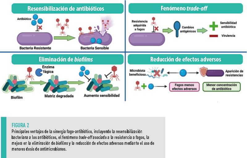 La aplicación conjunta de fagos y antibióticos ofrece múltiples beneficios, contribuyendo a mejorar la eficacia global del tratamiento frente a bacterias resistentes (Figura 2).