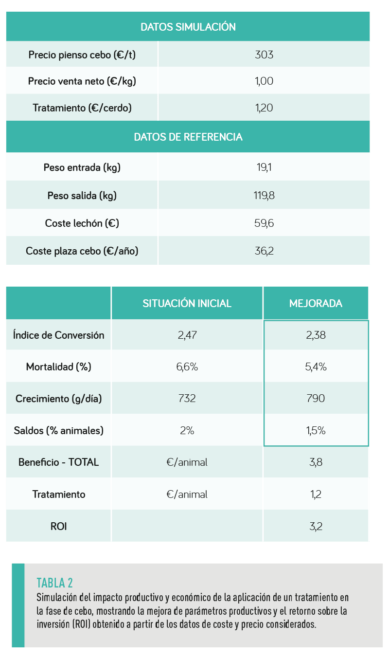 Para comprender mejor la utilidad que puede tener el cálculo del ROI desde un punto de vista práctico, a continuación, se presenta una simulación para valorar el interés económico que tiene un tratamiento con un coste de 1,20 €/cerdo y que permite mejorar algunos de los principales parámetros productivos en la fase de cebo.