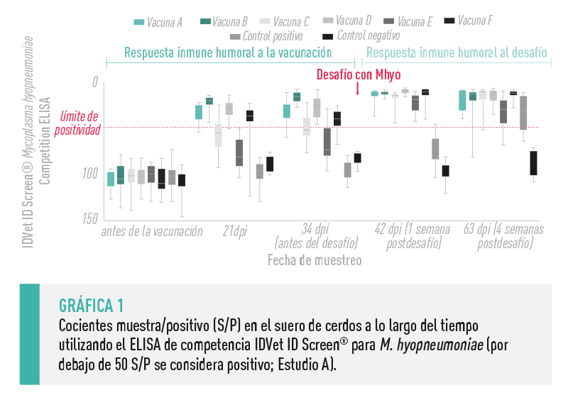 El nivel de anticuerpos frente a Mhyo se evaluó en distintas semanas durante el estudio mediante el kit IDVet ID Screen® Mycoplasma hyopneumoniae Competition ELISA.
