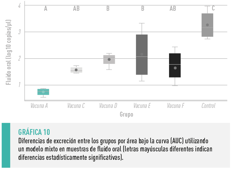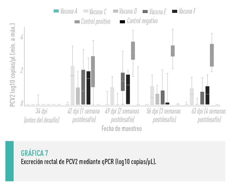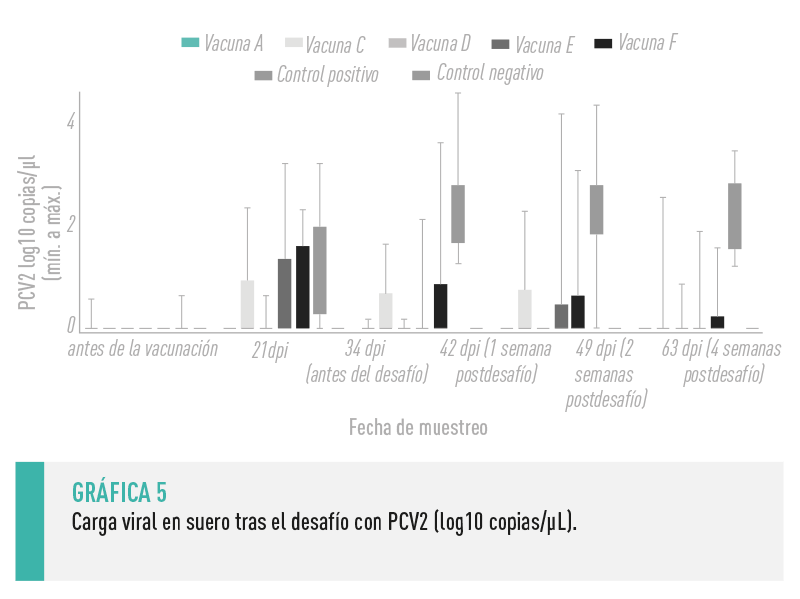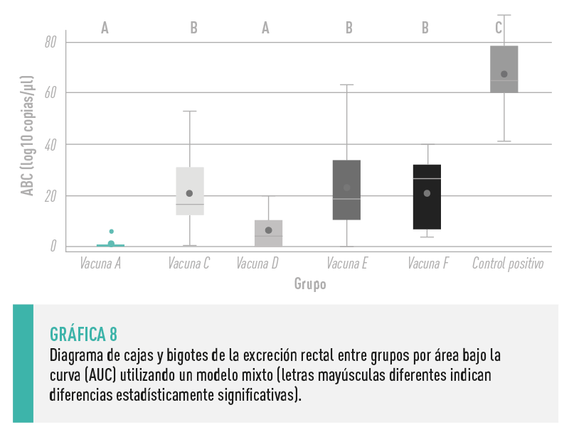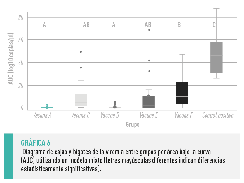 Todas las vacunas redujeron la carga de PCV2 en suero, siendo la vacuna A y la vacuna D las únicas en controlar completamente la viremia, tal como muestra el gráfico de área bajo la curva (AUC) de PCV2d (Gráfica 6).