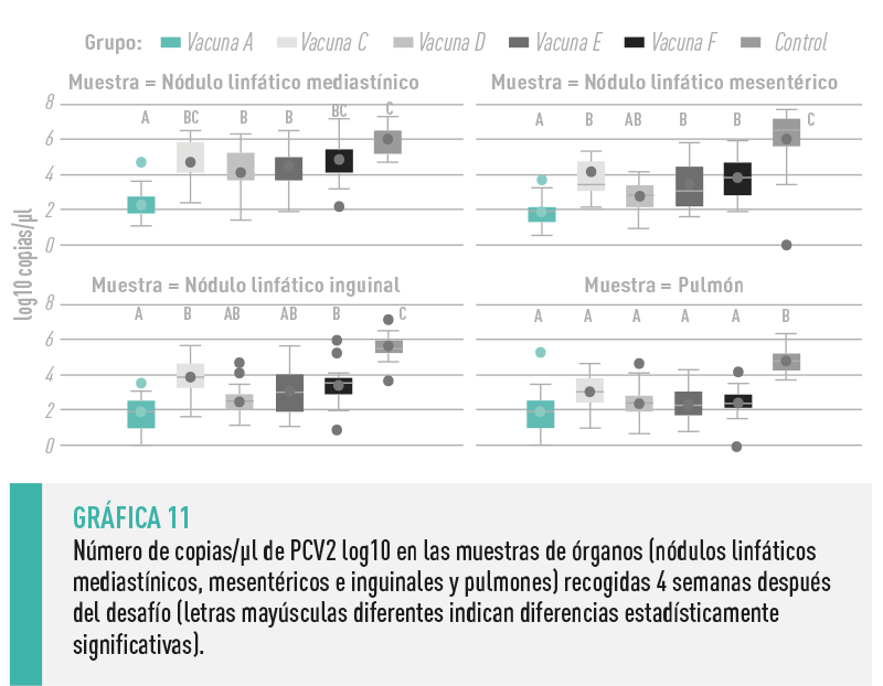 Casi todas las vacunas lograron reducir significativamente la carga de PCV2d en tejidos en relación con el grupo control, pero la vacuna A mostró las cargas más bajas.
