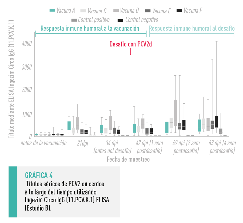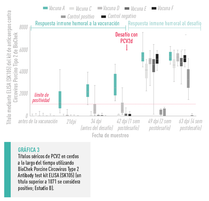 Usando el Kit ELISA PCV2 BioChek (SK105), los animales vacunados con la vacuna A fueron los más rápidos en seroconvertir, siendo los únicos animales positivos a 21, 34 y 42 días postvacunación, antes del desafío, demostrando así la vacuna A una alta capacidad inmunogénica.