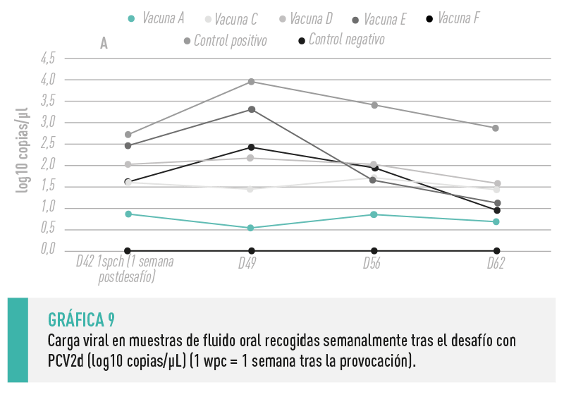 En fluidos orales, todas las vacunas redujeron la carga de PCV2d en relación con el control, pero la vacuna A redujo la carga de forma más significativa.