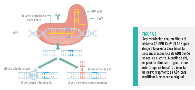 Los investigadores adaptaron este mecanismo de defensa inmunitaria para aplicarlo a la edición del ADN (Figura 2), creando una pequeña molécula de ARN con una secuencia “guía” corta que se une de forma específica a una secuencia objetivo del ADN de una célula, de manera similar a los segmentos de ARN que las bacterias producen a partir de los arreglos CRISPR.