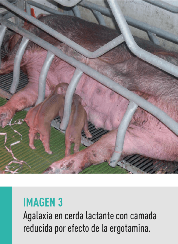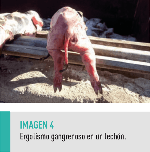 A parte de los trastornos reproductivos, la intoxicación por ergotamina puede causar vasoconstricción y daño endotelial que conduce a isquemia y gangrena seca, especialmente en la cola, orejas y pezuñas de los lechones (Imagen 4).