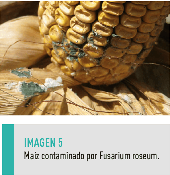 El deoxinivalenol (DON) o vomitoxina es producida principalmente por Fusarium roseum o Fusarium graminearum (Imagen 5).