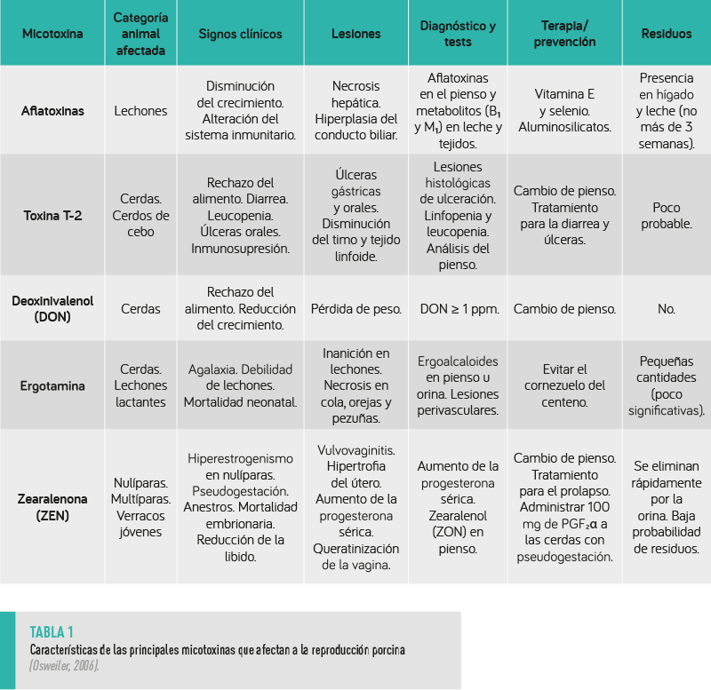 Hasta el momento se han identificado más de 300 micotoxinas. Sin embargo, las micotoxinas que cobran una mayor relevancia en la alimentación porcina y que guardan relación con la reproducción son (Tabla 1):