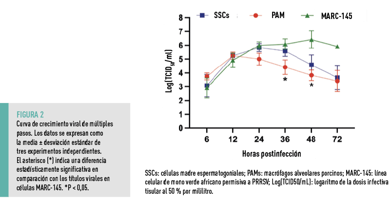 A continuación, se evaluó la cinética de replicación del PRRSV en SSCs y se comparó con la replicación viral en PAMs, la principal célula diana del virus, y en células MARC-145, una línea celular de mono permisiva al virus (Figura 2).