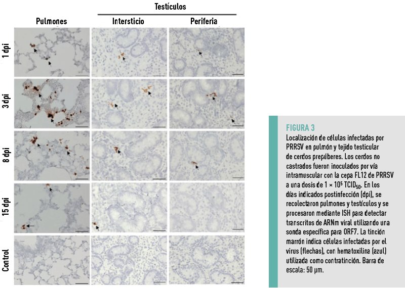 En estudios previos, se ha señalado que la infección de SSCs por PRRSV puede detectarse tan pronto como a los 7 dpi en verracos sexualmente maduros7.