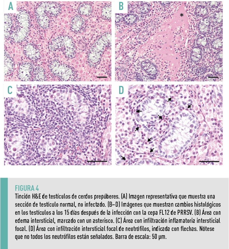 En este estudio, no se detectaron células germinales infectadas por PRRSV en los túbulos seminíferos de cerdos prepúberes durante los 15 días de observación.