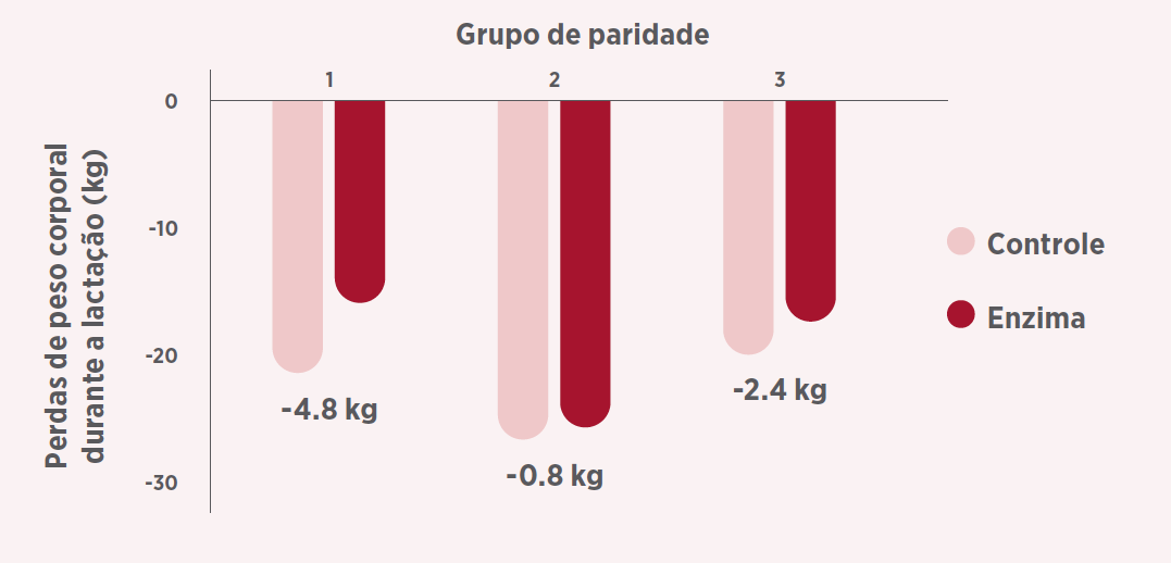 A suplementação com enzimas reduz a perda de peso corporal durante a lactação, conforme demonstrado em uma meta-análise. A redução média é limitada a aproximadamente 3 kg por matriz.