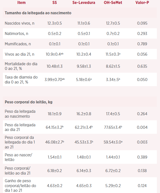 Além disso, ao contrário do SS e da Se-Levedura, os leitões do grupo Selisseo® apresentaram peso total de leitegada significativamente maior.
