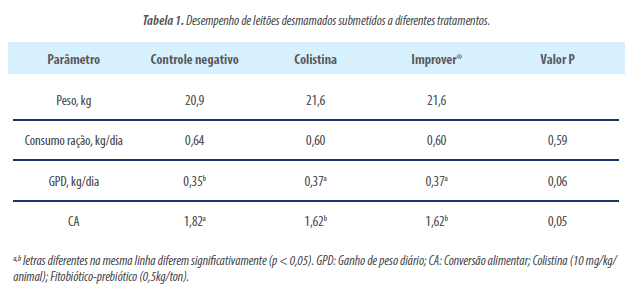 O GPD foi significativamente maior nos grupos colistina e aditivo Improver® (0,37 kg/dia) em relação ao grupo controle (0,35 kg/dia), com tendência estatística (P=0,06).