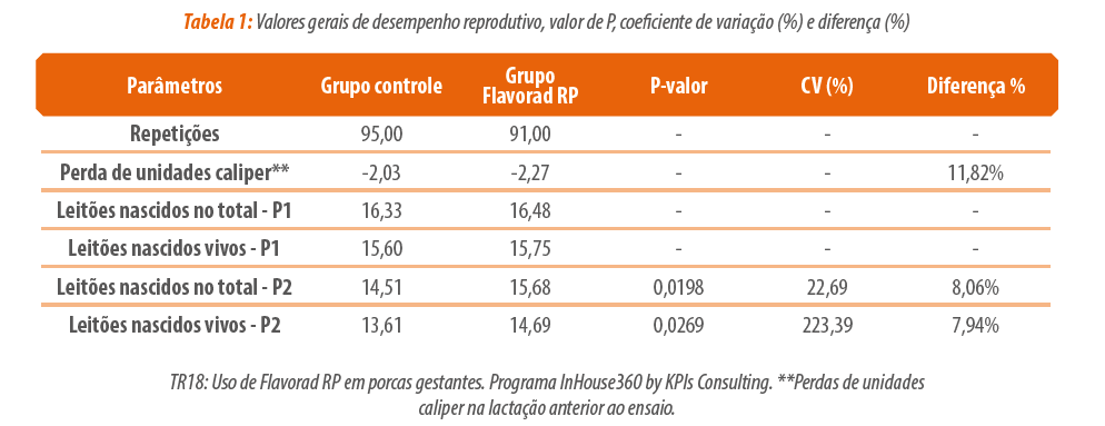 Foram comparados dois grupos de animais: um recebendo alimentação convencional e outro com a mesma dieta acrescida da inclusão diária de Flavorad RP® durante os primeiros 40 dias de gestação. Os resultados mostraram um aumento significativo (P<0,05) no número de leitões nascidos totais e nascidos vivos no grupo Flavorad RP®, sem diferenças em eventos reprodutivos.