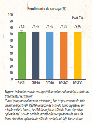 Os resultados preliminares indicaram que, quando adequadamente planejadas, restrições moderadas de lisina digestível podem ser aplicadas sem prejuízos evidentes ao peso final (P = 0.305). Da mesma forma, o rendimento de carcaça não foi afetado pelos tratamentos (P = 0.534; Figura 1), embora a confirmação de ganho compensatório exija avaliação detalhada da dinâmica de crescimento ao longo do período de realimentação.