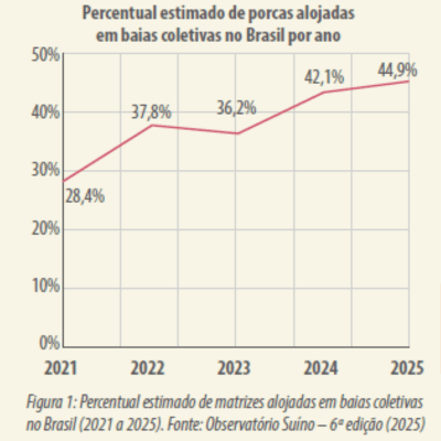 A transição do sistema de celas individuais que predominava no país até poucos anos atrás para gestação coletiva é uma realidade deste pujante segmento do agronegócio, atualmente estima-se que cerca de 44,9% das matrizes no Brasil, estão sendo alojadas em baias coletivas durante a gestação (Figura 1).