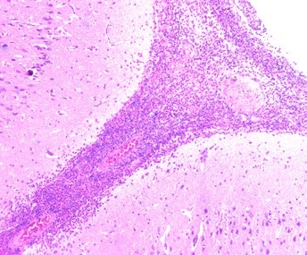 Desde el punto de vista histológico, esta lesión se caracteriza por un infiltrado inflamatorio predominantemente neutrofílico, asociado a la deposición de fibrina que expande el espacio submeníngeo (meningitis fibrinosupurativa) (Imagen 3).
