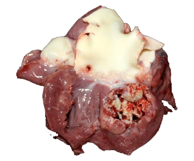 Imagen 12. Corazón (endocardio) de cerdo con endocarditis valvular fibrinosupurativa. Se observa un émbolo de fibrina y tejido necrótico adherido a la válvula auriculoventricular izquierda.