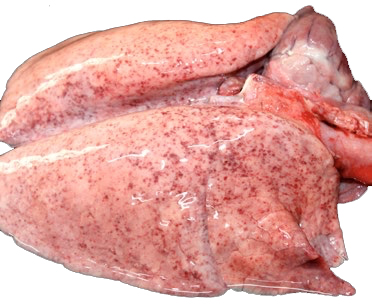 Imagen 13. Pulmón de cerdo (muerte natural) con neumonía intersticial y microhemorragias. El parénquima pulmonar se presenta edematoso, sin colapso, y con múltiples áreas hemorrágicas.