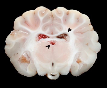 Imagen 4. Cerebro de cerdo con plexocoroiditis fibrinosupurativa. Corte transversal del encéfalo con deposición de exudado purulento en el plexo coroideo de los ventrículos laterales y del tercer ventrículo.