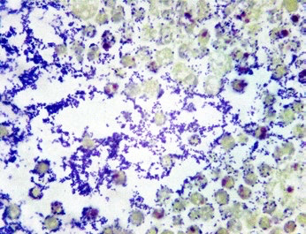 Imagen 5. Cerebro de cerdo con meningoencefalitis causada por S. suis. Se observan cocos y diplococos grampositivos en la adventicia de un vaso sanguíneo (Tinción Brown-Brenn, objetivo 100x).