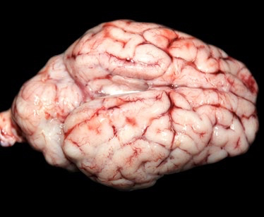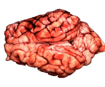 Imagen 6. Cerebro de cerdo con hiperemia difusa y microhemorragias. Superficie encefálica intensamente enrojecida, con presencia de vasos leptomeníngeos visibles y hemorragias multifocales.
