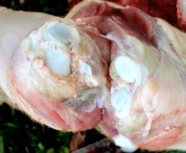 Imagen 7. Articulación de cerdo con artritis fibrinosupurativa y edema periarticular. Se aprecia una acumulación de líquido turbio y fibrina en la superficie articular, así como un edema intenso en el tejido muscular adyacente.