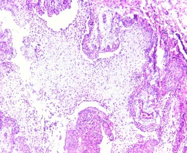 Imagen 8. Articulación de cerdo con artritis fibrinosupurativa difusa moderada. Se observa infiltración de neutrófilos y fibrina en la membrana sinovial, así como extravasación hacia la cavidad articular (Tinción H&E, objetivo 5x).