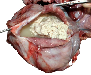 Imagen 10. Pericardio de cerdo con pericarditis fibrinosupurativa, cerdo. El pericardio parietal aparece distendido debido a la acumulación de material fibrinoso y purulento.