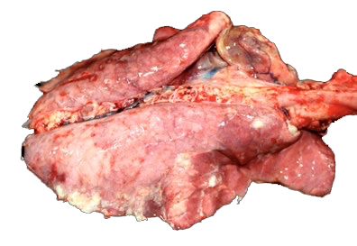 | Al tratarse de una enfermedad inflamatoria sistémica, pueden verse afectados tanto la serosa como el endocardio, y algunos animales pueden presentar dificultades respiratorias asociadas a neumonía, pleuritis y endocarditis.