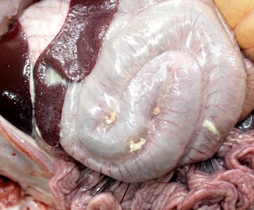 Imagen 11. Peritoneo de cerdo con peritonitis fibrinosa. Se observa fibrina adherida a la serosa del intestino, el bazo y el hígado.