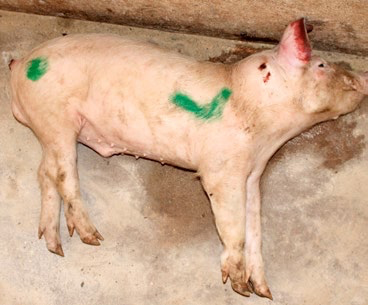 Imagen 1. Cerdo de recría con estreptococia. Presenta signos clínicos de hiperemia y necrosis en la punta de las orejas y la cola, así como signos neurológicos como decúbito lateral, opistótonos e hiperestesia en las extremidades pélvicas y torácicas.