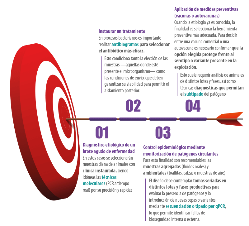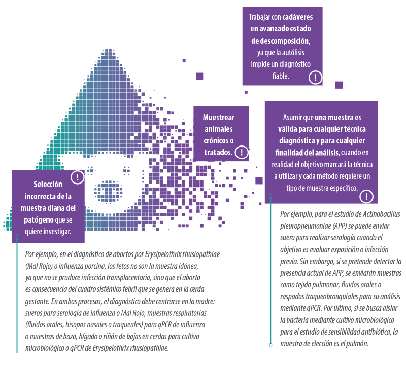 Seleccionar la muestra correcta condicionará el éxito del diagnóstico, por lo que se deberá estudiar el proceso presente en los animales, conocer el historial sanitario de la granja y con todo ello planificar el muestreo a realizar.