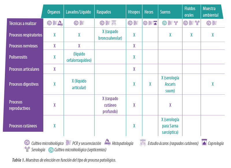 Para seleccionar la muestra a tomar se deben tener en cuenta varios condicionantes: El proceso clínico observado: respiratorio, nervioso, articular, digestivo, reproductivo, etc. (Tabla 1).